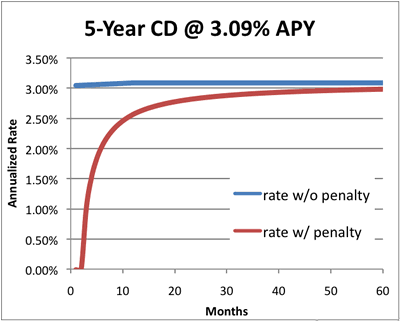 The current Ally Bank 5-year CD yields 2.00% APY (as of 1/05/15). Rates change constantly, but let’s assume you have a certificate of deposit from any bank paying 3.09% APY with an early withdrawal penalty of the last 60 days of interest. (3.09% APY = 3.04% rate compounded daily.) Here’s how your actual annualized interest rate would fluctuate given your holding period.