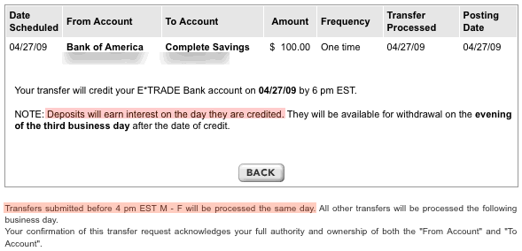 • Friday: You schedule a transfer of $1,000 from Bank A to E-Trade. You start earning interest at E-Trade on Friday. Nothing has happened at Bank A.