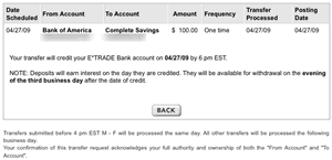• Thursday: $1,000 is now available to withdraw from E-Trade. You schedule a transfer to Bank B. $1,000 is debited from your account at E-Trade.