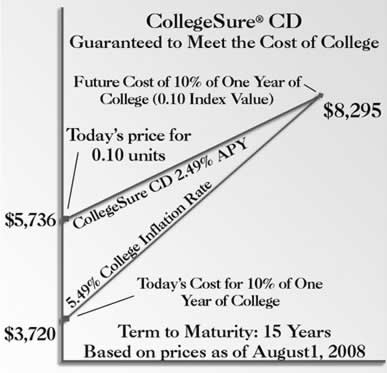 Offered by the College Savings Bank, these are FDIC-insured certificates of deposit which offer an interest rate linked to college tuition levels. The CollegeSure CD earns an annual percentage yield (APY) over the life of the investment that is 3.00% less than the college inflation rate. (For a while, this margin was only 1.5%.) These are only available through either the Montana or Arizona 529 plans, but you can use the proceeds towards a school in any state.