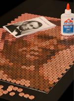 Actually, you can’t copyright an “idea”, only the execution of that idea. So as long as my portrait is significantly different in execution, (which it is) I don’t need to worry about infringing on the work they did. (Although, I do admire it… I re-read the article and they apparently used $24 worth of pennies, so it is 3x as large as mine!)