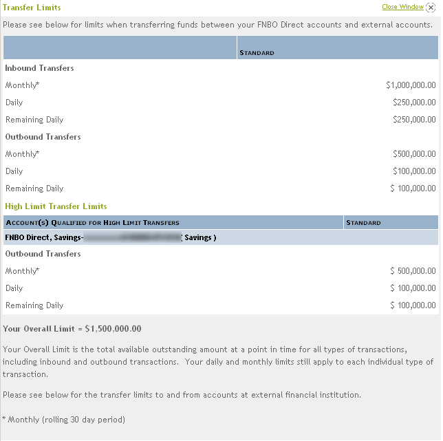 I deposited money about a year ago with FNBO and I have had very good service. When they first got going on line, there was a hitch in my account on line doing transfers, but they were so helpful – during the time this was going on, they wired money with no charge until they could get it worked out. They called me back to check on things and I have had great luck with them. They have been the best on line bank and I am using others. I get transfers done frequently, no problem. Thanks FNBO!!