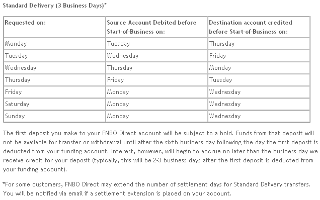 I’m not sure if it would be any quicker to use them as a direct deposit account or not, although I would tend to think it would be since most banks. I guess one of the benefits of using direct deposit would be cutting out one extra step in getting the money to a savings account (whether it is FNBO or any other savings account). If you go with the standard method of transfers, you have to schedule your transfer for the date of your pay and then FNBO would have to initiate that transfer. I don’t remember how long it takes for FNBO to initiate transfers and then credit the money to your savings, but if it is like one of my online savings accounts, it might be slow.