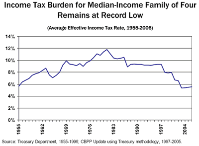 Next, here is a 2006 chart from the Center on Budget & Policy Priorities, which is based on Treasury Dept. data. The Center estimates that the median-income family of four will pay only 5.6 percent of its income in federal income taxes in 2006, the lowest since 1955.