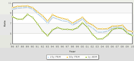 While doing some more research into a possible refinance or loan modification, I ran across this chart of historical mortgage rates from 1986 from HSH.