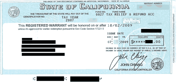 Back in July, the state of California started issuing what they called Registered Warrants, aka IOUs, to taxpayers, vendors, and local governments to whom they owed money. Due to a “cash-flow infusion” from JP Morgan Chase, the redemption date was moved up a month to as early as last Friday, September 4th. Through August 31st, the state had issued 457,238 IOUs totaling $2.37 billion. Here’s mine 🙂