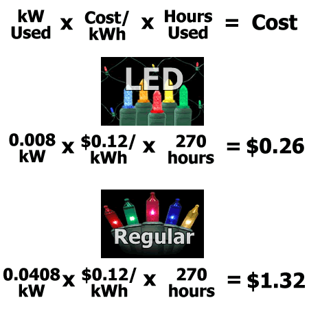 Amount of electricity used. Looking at the box of regular incandescent lights, they use 40.8 watts per 100 light strand (0.0408 kW). The 100-light strand of LEDs used 8 watts (0.008 kW). You should be able to find these on any box of lights, especially the traditional kind as they can draw too much current if you connect too many together.