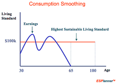 Then there’s ESPlanner, which represents “Economic Security Planner”. It is based on consumption smoothing, an economic theory where the primary goal of financial planning is instead to avoid abrupt changes in one’s standard of living. Here is one graphical explanation: