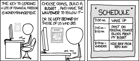 XKCD is a popular online comic strip, and recently there was a funny one about what really goes on behind time management and productivity blogs. I decided to take advantage of their creative commons license and adapt the original comic to personal finance blogs.