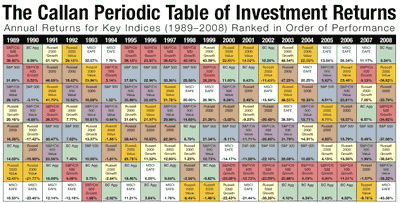 Investment consultant firm Callan Associates created a neat visual representation of the relative performance of 8 major asset classes over the last 20 years. You can find the most recent one below (click to view PDF), which covers 1989 to 2008. Each year, the best performing asset class is listed at the top, and it sorts downward until you have the worst performing asset. You can find previous versions here.