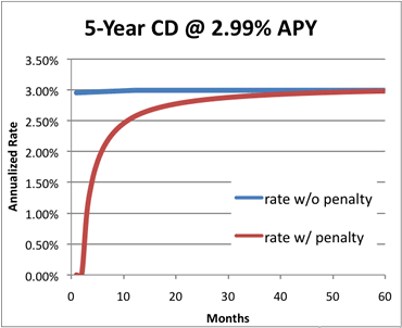 Okay, so Ally does spend a lot of money on advertising, but a feature they rarely mention is actually the best reason to open an account with them. They only hit you with a early withdrawal penalty of 60-days of lost interest if you “break” a CD with them. The Ally Bank 5-year CD currently yields 1.60% APY (as of 10/25/13). Rates change constantly, but let’s assume you have a certificate of deposit from any bank paying 2.99% APY with an early withdrawal penalty of the last 60 days of interest. (2.99% APY ~= 2.95% rate compounded daily.) Here’s how your actual annualized interest rate would fluctuate given your holding period.