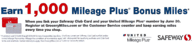 If you shop at Safeway or one of their partner stores Dominick’s, Vons, Pavilions, or Genuardis, you can get 125 United Airlines Mileage Plus miles per $250 spent. I’ve probably earned thousands of miles over the last few years. You simply have to go to GroceryMiles.com and register your club card. Today, I got one of those “Catalina” coupons that offered an additional 1,000 mile bonus if you sign up by 6/30. Although there seems to be no mention on the website, here is a scan of the coupon: