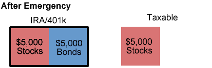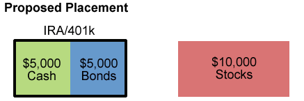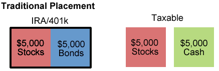 I’ll use the example given. Let’s say you have a 401(k) with a balance of $10k and also taxable assets of $10k, for $20,000 total. You choose to have $10k in stocks, $5k in bonds, and $5k in cash for your emergency account. The “traditional” placement for an emergency fund is in your regular taxable account, perhaps in a bank savings account. The rest of the assets are distributed according to this tax-efficient placement chart.