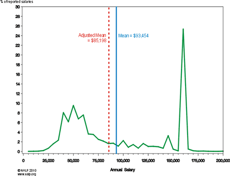 The NALP found the national median starting salary for full-time law jobs for the Class of 2009 was $72,000 and the average was $93,454. After adjusting for the fact that many smaller law firms don’t report salary details (and also tend to pay less), it found the adjusted average salary to be $85,198. But you should also consider the distribution of the salaries as well, shown below.