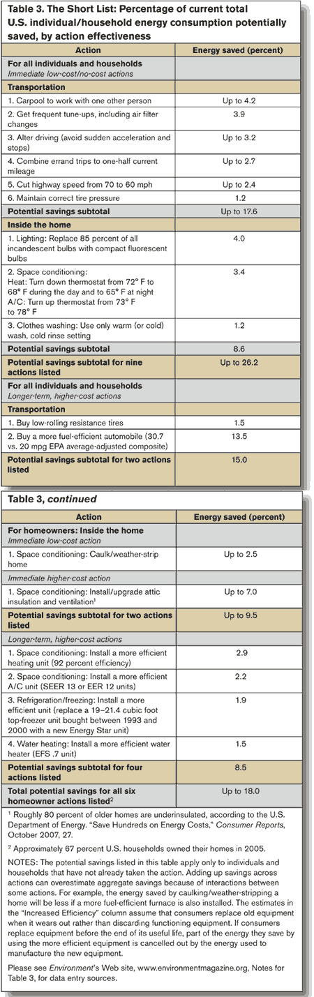 A comparison of energy saved by curtailment and by increased efficiency in Table 2 reveals that efficiency-improving actions generally save more energy—and reduce carbon emissions more—than curtailing use of intrinsically inefficient equipment. For example, buying and maintaining a highly fuel-efficient vehicle saves more energy than carpooling to work with another person, lowering top highway speeds, consolidating shopping or errand trips, and altering driving habits in an existing gasoline-inefficient motor vehicle. This general finding challenges the belief that energy savings entail curtailment and sacrifice of amenities. Not only is efficiency generally more effective than curtailment, but it has the important psychological advantage of requiring only one or a few actions. Curtailment actions must be repeated continuously over time to achieve their optimal effect, whereas efficiency-boosting actions, taken infrequently or only once, have lasting effects with little need for continuing attention and effort.