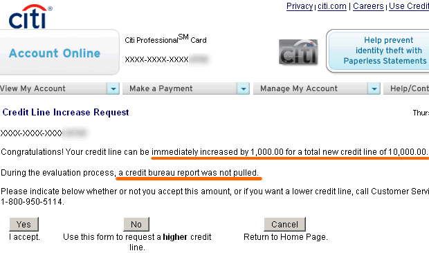 Sometimes your issuer will automatically increase your limits without asking, like Citibank and MBNA. But many times you need to ask and it often involves a credit check. To be honest, I haven’t very aggressive recently in getting my credit limits as high as they could be. The only thing that I do, because it literally takes 5 seconds to do, is to occasionally request an instant credit limit increase online with Citibank. It doesn’t even hit you with a hard credit pull! Here’s how: