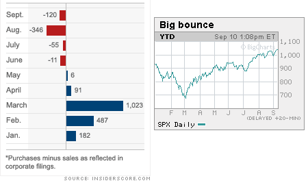 Therefore, it’s interesting to see how insider trading activity as a whole by comparing the amount of shares being bought and sold during all this volatility, and then compare that with the market. See the graph below compiled in this CNN Money article: