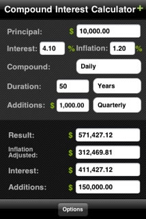 A company contacted me to see if I wanted six free coupon codes for their compound interest calculator iPhone app. It seemed like a win-win, they get publicity and readers get some free stuff. Also, I could actually try it out since I have an iPod Touch. (I got nothing else.) If you have iTunes, read about the app here.