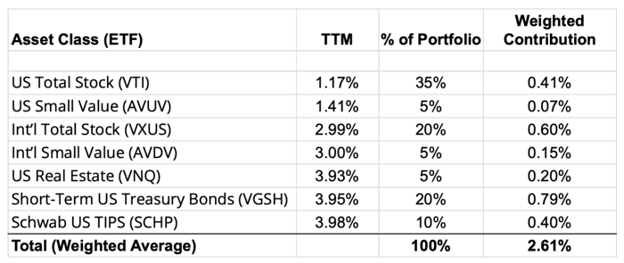 Dividend and interest income yield. To estimate the income from my portfolio, I use the weighted “TTM” or “12-Month Yield” from Morningstar (checked 4/8/26), which is the sum of the trailing 12 months of interest and dividend payments divided by the last month’s ending share price (NAV) plus any capital gains distributed (usually zero for index funds) over the same period. My TTM portfolio yield is now roughly 2.61%.