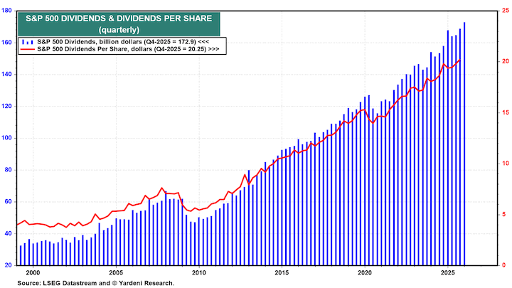 Here is the historical growth of the S&P 500 total dividend, which tracks roughly the largest 500 stocks in the US, updated as of 2026 Q1 (via Yardeni Research):