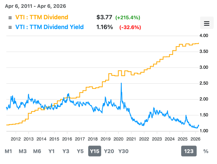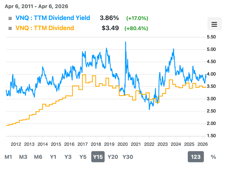 In the case of Real Estate Investment Trusts (REITs), they are legally required to distribute at least 90 percent of their taxable income to shareholders as dividends. Historically, about half of the total return from REITs is from this dividend income. Here is an updated chart of the trailing 12-month (ttm) dividend per share over the last 15 years paid by the Vanguard Real Estate Index ETF (VNQ).