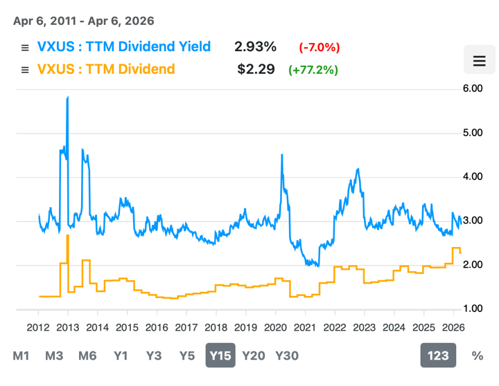 European corporate culture tends to encourage paying out a higher (sometimes even fixed) percentage of earnings as dividends, but that also means the dividends move up and down with earnings. The starting yield is currently higher but may not grow as reliably. Here is an updated chart of the trailing 12-month (ttm) dividend per share over the last 15 years paid by the Vanguard Total International Stock ETF (VXUS).