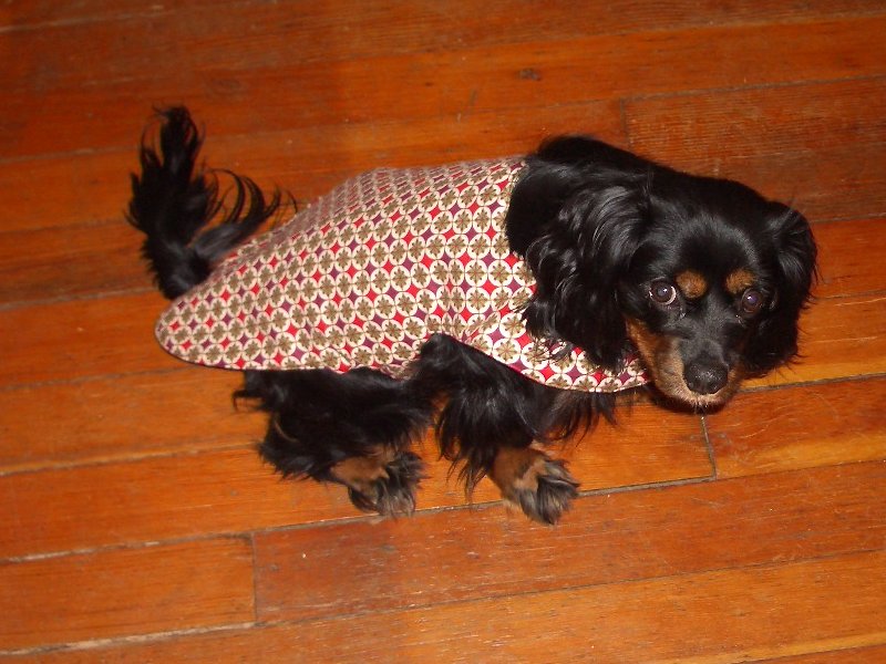 Prototype #1: A handmade reversible raincoat/jacket, as modeled by our dog James. This is all made by my wife, with fabric scraps. One side is softer fleece, the other is waterproof. It has Velcro for easy attachment/detachment.