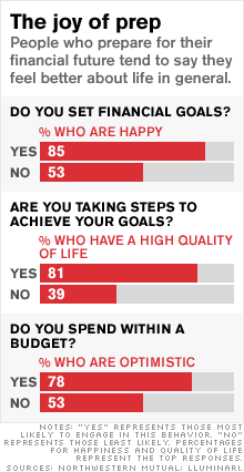 In a recent issue of Money magazine, Walter Updegrave shared the results of a recent survey by insurer Northwestern Mutual and health education company LLuminari. It showed that people who perform financial planning tend to feel happier than those who don’t. The article is also online here – Save for tomorrow, be happy today.