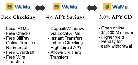 I know WaMu sounds like a good deal but we all know it is on the brink of failure. I think a better choice is Everbank. They pay 3.5% on their savings vs 4% at WaMu, but they pay 2% on their checking vs 0% at WaMu. Plus they are a much more stable bank financially. So with the interest on the checking you most likely will come out ahead at EverBank, and can sleep at night.