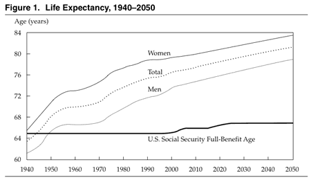 In 1940, the required age to receive full benefits from Social Security was 65. According to chart below, most people didn’t even reach 65 at that time. Today, average life expectancies are over 11 years longer (and still rising), yet the full retirement age is only 67. That’s a lot of people getting paid out.
